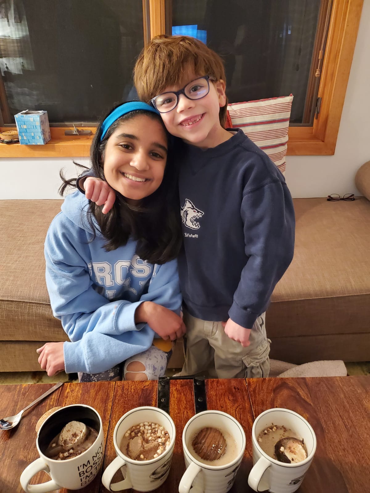 Me and my brother drinking hot chocolate on a snowy day!